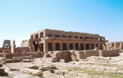 (708) Le temple d'Amada est situé entre la 1ère et la 2e cataracte, sur la rive ouest du Nil. Il a été conçu et décoré comme un monument consacré par deux rois : MenKheperRê-Thoutmosis III et son fils ÂaKheperouRê-AmenHotep II. On l'a déplacé d'un seul bloc pour le soustraire aux eaux du grand barrage d'Assouan.