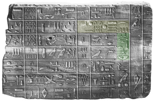 conservé au Louvre (627) provenant d'une liste d'offrandes à présenter chaque année aux dieux, lors des fêtes du nouvel an. Une date y figure, celle du 3e mois des moissons, le 28e jour (3M,28), et surligné par nous en jaune sur la photo) correspondant au lever (héliaque) de Sirius (surligné en vert) mais l'année relative du règne de MenKheperRê n'y figure pas. Il est toutefois aisé de la calculer, et nous avons ainsi obtenu l'an 38. Nous en expliquons le procédé fort simple en annexe.