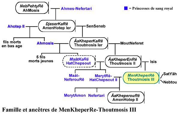 Mais le sort semble s'acharner sur cette famille royale. Le couple n'a pas non plus d'héritier mâle direct, mais deux filles : (Maât-)NeferouRê et MerytRê-HatChepsout (certains historiens mettent en doute l'origine royale de MerytRê). A la mort de Thoutmosis II, c'est encore un autre fils naturel du souverain, appelé lui aussi Thoutmosis, né de la concubine Isis, qui aura été divinement choisi comme futur roi, au temps où son père vivait encore (voir cet épisode ci-dessous). Il a environ six ans (certains disent onze ans) et va être couronné, vers 1479, sous le nom de MenKheperRê-Thoutmosis III. Sa tante HatChepsout assure alors la régence durant environ six ans, avant de s'approprier le pouvoir. Nous y reviendrons.
