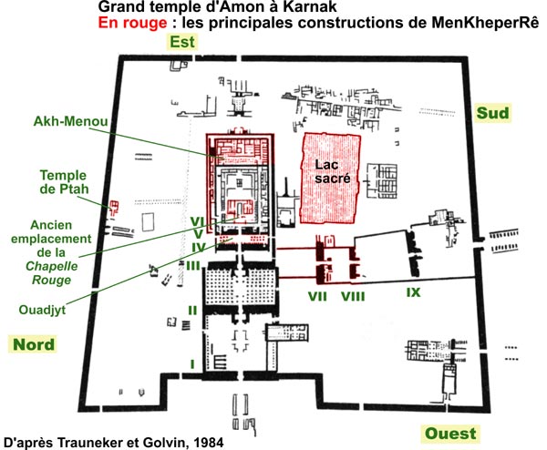 Thoutmosis Ier entreprend des travaux dans le temple de Karnak. Il y fait construire le 4e et le 5e pylône entre lesquels on aménage une cour-vestibule appelée Ouadjyt, avec des colonnes de bois. Nous aurons l'occasion de revenir sur cette salle qui sera le théâtre, plus tard, d'un événement essentiel de la vie de MenKheperRê-Thoutmosis III. Deux obélisques, dont un seul subsiste aujourd'hui, y furent érigés plus tard pour le jubilé de la reine HatChepsout.