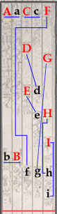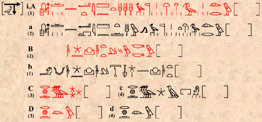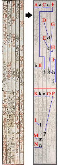 Erik Hornung présente en tableau la disposition de ces quinze sections numérotées de « A à P » pour les textes en rouges et de « a à p » pour ceux écrits en noir. (Les lettres J et j ne sont pas utilisées.) Je reproduis ce tableau ci-contre sous forme de deux photographies identiques de ces textes. Celle de droite présente des tons estompés pour une meilleure lisibilité des ajouts. La correspondance entre éléments rouges et noirs parfois éloignés est réalisée en traits bleus.