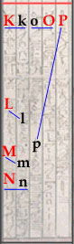 (11) Dans cette section P/p, le scribe a écrit en rouge ce qui aurait dû l'être en noir et inversement. De plus, la version noire p est tronquée au début. Aucune des sections O/o et P/p n'est suivie de l'espace habituel de séparation sauf o. Enfin, la section noire p est écrite en colonne 3, ce qui n'est logique qu'au vu de l'espace libre qui lui restait.