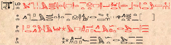 [Le scribe se rend compte qu'il risque de manquer de place pour terminer son texte. Il écrit donc des hiéroglyphes plus petits, plus tassés et va jusqu'à omettre les espaces qui devraient normalement séparer les sections. Mais il fait le contraire avec la section rouge de la 4e colonne (O) pour tenter d'occuper toute la surface disponible. Tout cela, sans compter les inversions de couleurs, donne une impression de travail vite fait.]