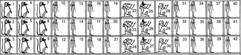 Neuf babouins qui ouvrent (les portes), douze déesses qui vénèrent, neuf divinités à têtes diverses qui adorent puis douze autres déesses qui <conduisent> le Grand Dieu, soit en tout quarante deux divinités.