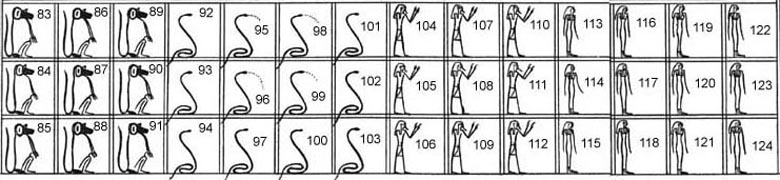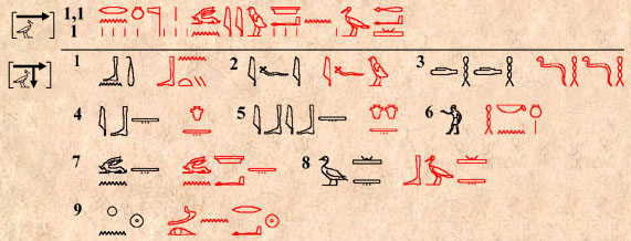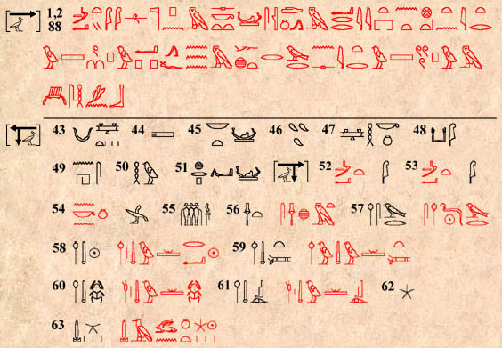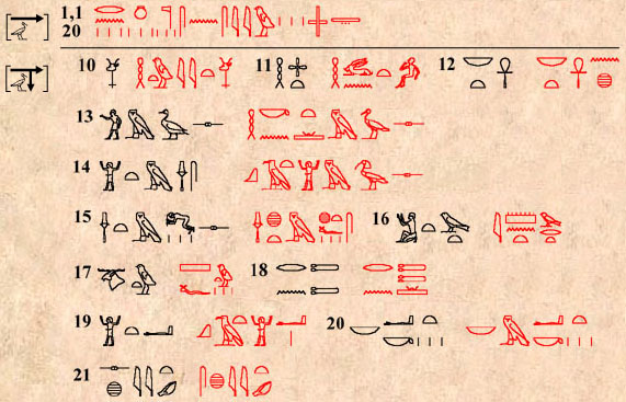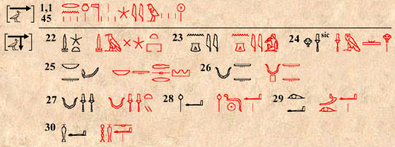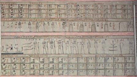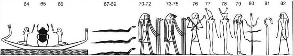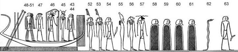 Neuf babouins qui jouent de la musique, douze serpents femelles qui éclairent, neuf dieux qui acclament puis douze déesses qui ovationnent le Grand Dieu, soit à nouveau quarante deux divinités.
