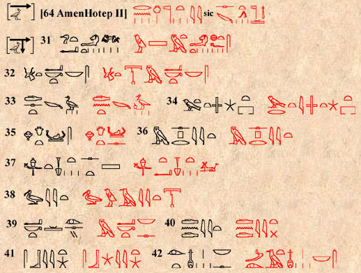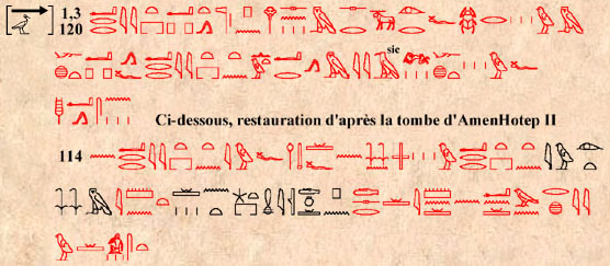 (44) Longue lacune, sans doute due à l'étourderie ou à la hâte du scribe, restaurée d'après le texte d'AmenHotep II.
