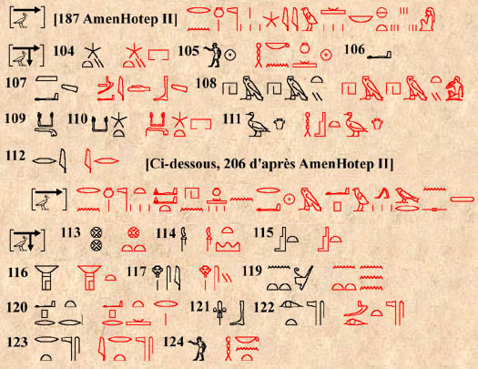 . Seuls les noms de quatre divinités (sur huit) sont écrits à l'emplacement que devrait occuper la barque, avec, en plus, l'expression gm wS, c'est-à-dire « trouvé endommagé ». Les scribes et les décorateurs des deux tombes ont certainement travaillé avec des modèles en mauvais état, surtout celui d'AmenHotep II, et il semble même certain qu'ils aient travaillé avec le même modèle qui serait passé d'une génération à l'autre.