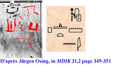 - [Graffiti en cursive hiératique à gauche du trait de repère et très au-dessus de la divinité n° 322. Sur la photo couleur, ils sont quasiment imperceptibles. Je les ai superposés en rouge sur fond noir et blanc pour une meilleure visibilité.]