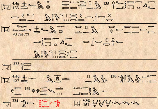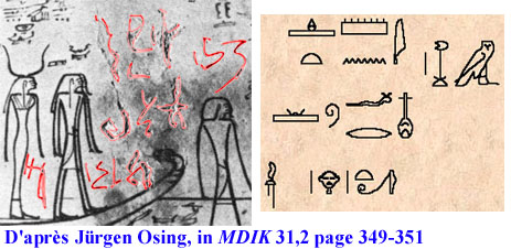 (181) Il semble bien que le grand désordre observé dans les hiéroglyphes vienne du document original avec lequel travaillait le scribe, car on retrouve cette confusion dans les mêmes passages d'autres tombes (Ramsès VI, par exemple). Est-ce voulu ou non ? Le scribe d'AmenHotep II (fils de notre MenKheperRê-Thoutmosis) s'efforce, dans ce cas comme dans d'autres, de corriger ce qu'il pense erroné. Voir aussi la rubrique « trouvé endommagé », dans le glossaire.