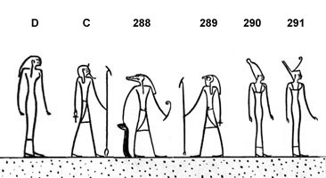 (167) Ces « deux dieux » sont vraisemblablement les deux ennemis de toujours, Horus et Seth. Cela inciterait à penser que le personnage représenté ici est Thot, car c'est lui qui sépare justement les deux combattants et les réconcilie. « Je suis Thot. J'ai apaisé Horus, j'ai apaisé les deux Combattants [Horus et Seth] dans leur moment de fureur : je suis venu, j'ai lavé le sang, j'ai apaisé la querelle ; (je suis) celui qui a englouti tout mal. » (Formules pour Sortir le Jour (=Livre des Morts), ch. 182). Mais cette interprétation semble difficilement acceptable car les deux personnages n°s 284 et 286 qui pourtant se tournent le dos sont décrits par le même texte tandis que le n° 286 a la tête de Seth. Ainsi 284 serait plutôt Horus et 286 plutôt Seth. Mais alors, que faire du texte descriptif en contradiction avec les images ? A moins qu'il faille comprendre : « Celui qui est un acteur dans la séparation »...