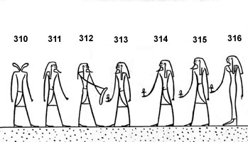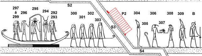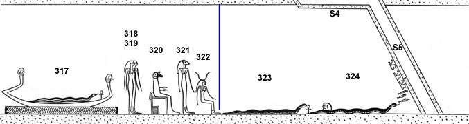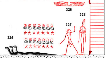 (192) Ce personnage n° 327 pourrait bien être Chou, car il est près de Maât et tous deux se trouvent sous le soleil ailé. Ils sont ainsi des émanations solaires. Voir Textes des Sarcophages (80 II,35 à 39) et la rubrique Chou dans le glossaire. Les divinités de ce registre sont en fait tournées vers la barque solaire qui arrive par le chemin oblique sablonneux. La porte à l'extrême droite du registre, « tranchante » comme les autres, en marque la limite.