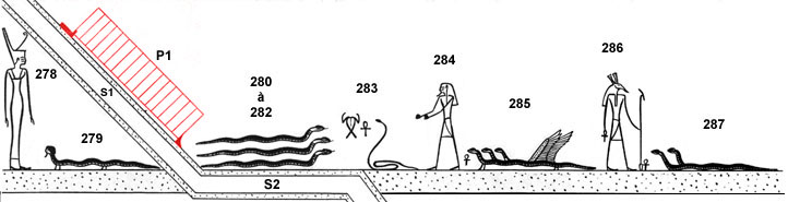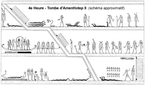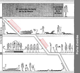 montre surtout des divinités affectées à la surveillance du lieu. Le texte situé en bas de la section S5 [4,4g 151] pose encore d'importants problèmes d'interprétation. Erik Hornung y voit une allusion à la « mer de flammes » de la 5e Heure.
